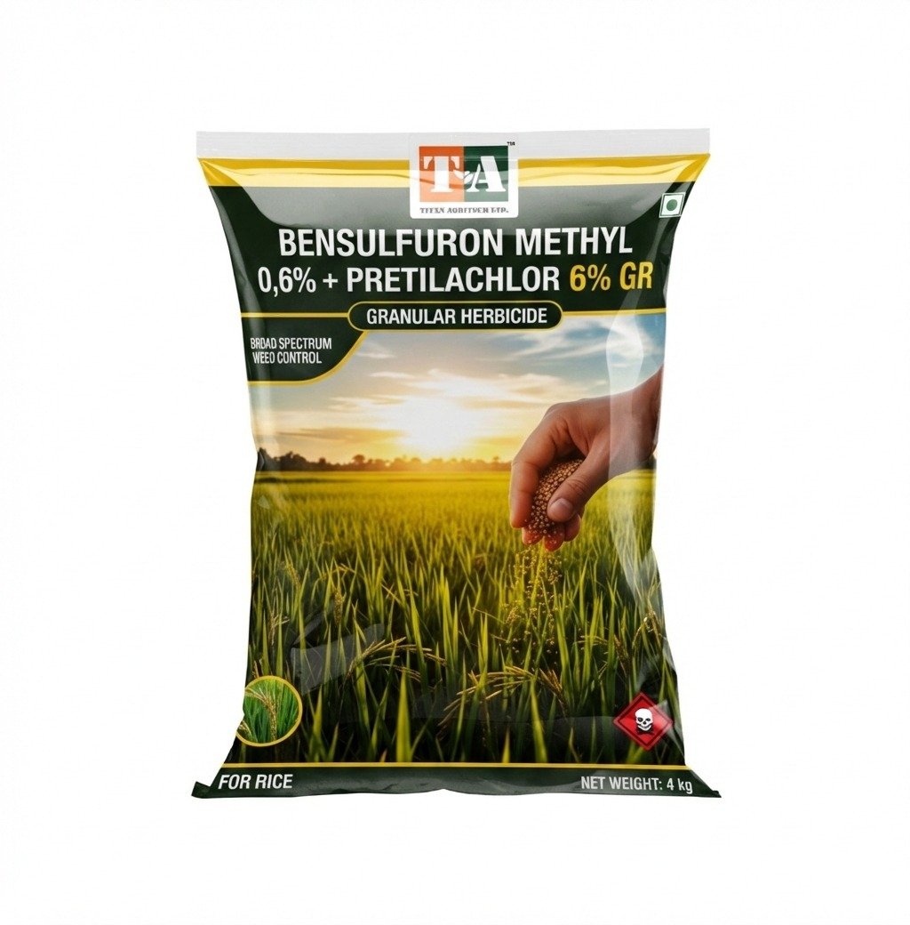 Bensulfuron Methyl 0.6% + Pretilachlor 6% GR is a selective pre-emergence herbicide used in transplanted and direct seeded rice. It combines sulfonylurea and chloroacetamide chemistry to provide broad spectrum weed management. The granular formulation makes it easy to apply directly in standing water which spreads uniformly in the field. This combination controls major sedges, broadleaf weeds and annual grasses at the early stage and gives the rice crop a clean and healthy start. Mode of Action Bensulfuron Methyl inhibits acetolactate synthase enzymes which block the synthesis of branched chain amino acids in weeds leading to stunted growth and death. Pretilachlor inhibits cell division and elongation by blocking protein and lipid synthesis in susceptible weeds. Together they provide strong and complementary action giving season long protection. Benefits • Broad spectrum control of sedges grasses and broadleaf weeds in rice • Granular formulation easy to apply in standing water with uniform distribution • Dual mode of action provide complete weed management and delay resistance • Pre emergence activity ensure weed free condition during crop establishment • Long duration residual effect reduce need of repeated weeding • Enhance rice yield and quality by reducing early stage crop weed competition