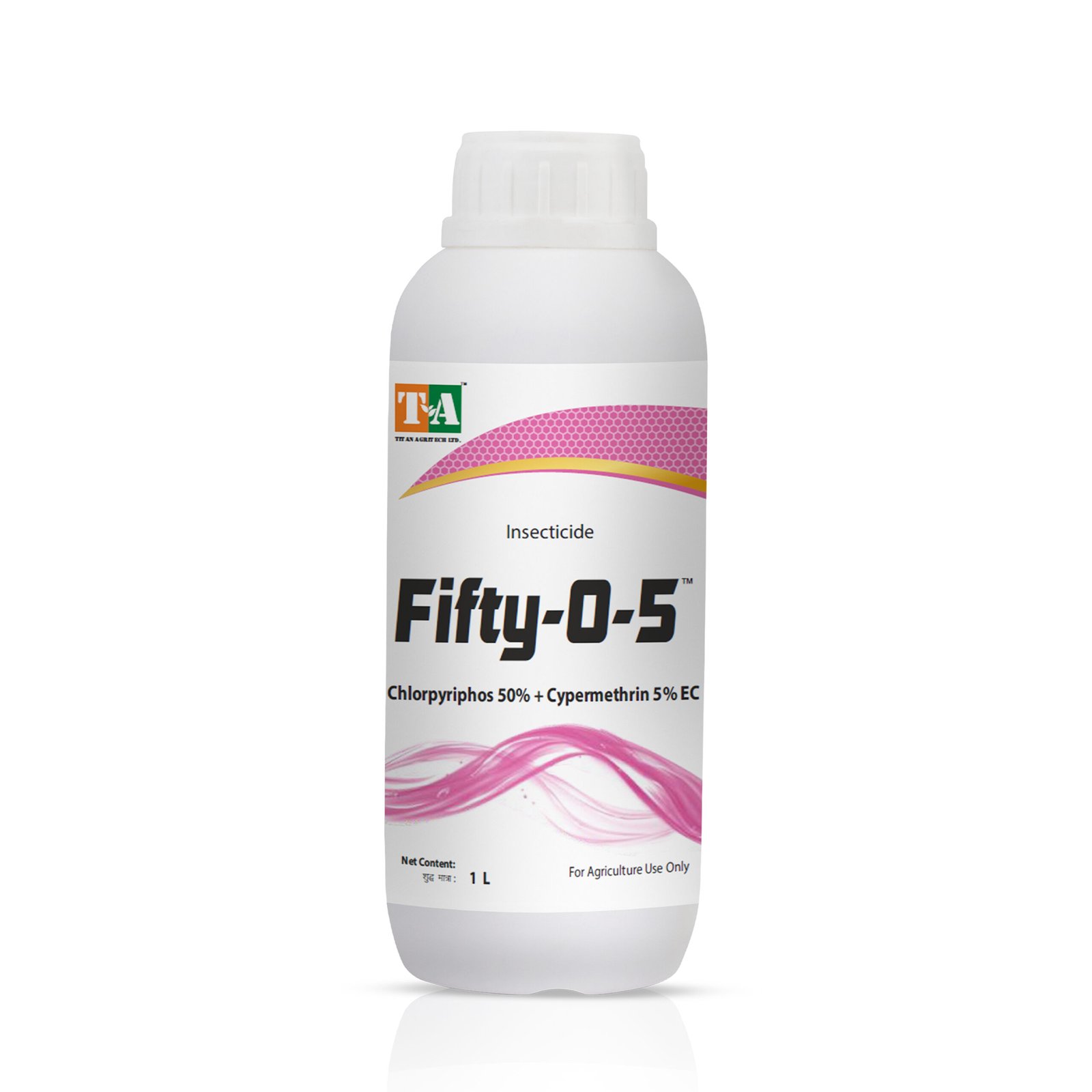 Fifty-O-5 is a powerful broad-spectrum insecticide formulated with two active ingredients. It delivers fast and effective control of a wide variety of chewing and sucking pests. Combining the systemic and contact properties of Chlorpyriphos with the rapid knockdown effect of Cypermethrin this product offers synergistic action that helps in complete protection of your crops. Fifty-O-5 (Chlorpyriphos 50% + Cypermethrin 5% EC) is ideal for use in cotton, rice, vegetables, pulses, and oilseeds. This product protects the crop and improves the yield.